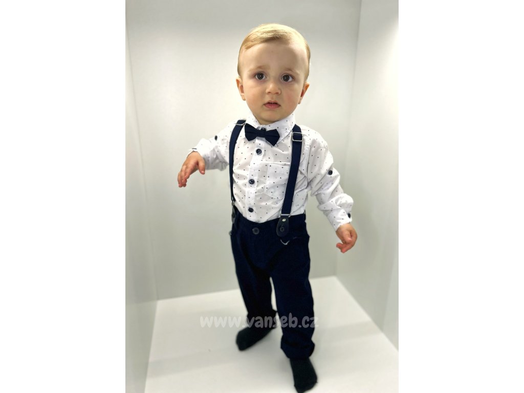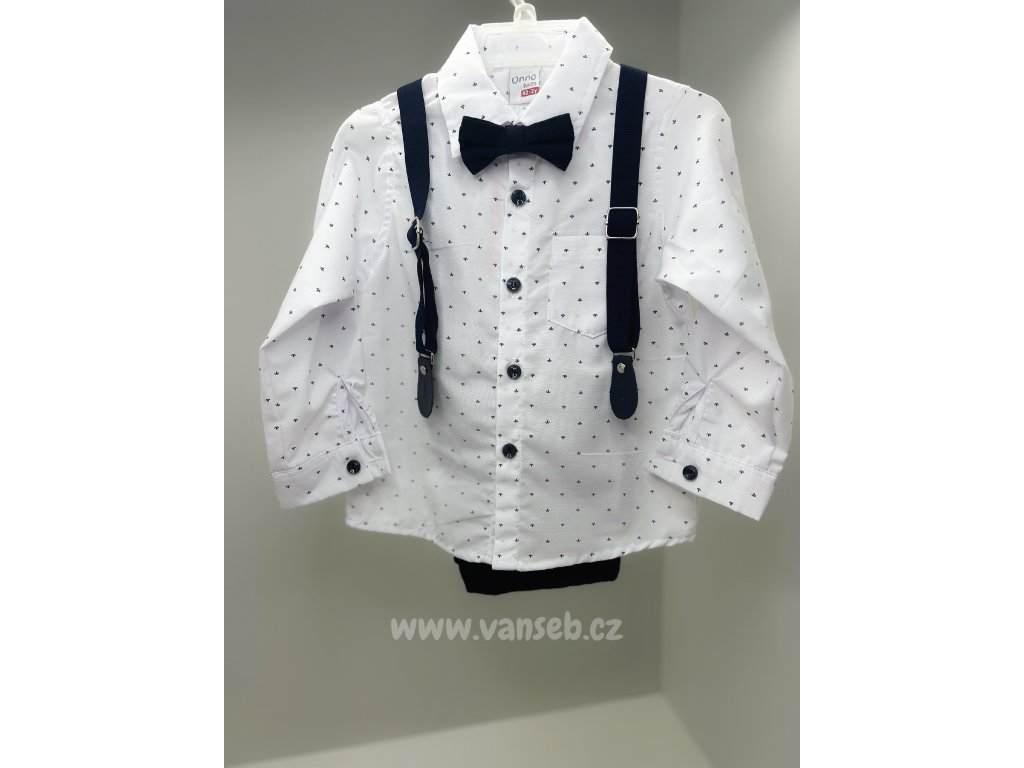 Součástí setu je košile, motýlek, kalhoty a kšandy. Elegantní a nadčasový vzhled v kvalitním zpracování. Vhodné na svatby, oslavy a různé příležitosti.