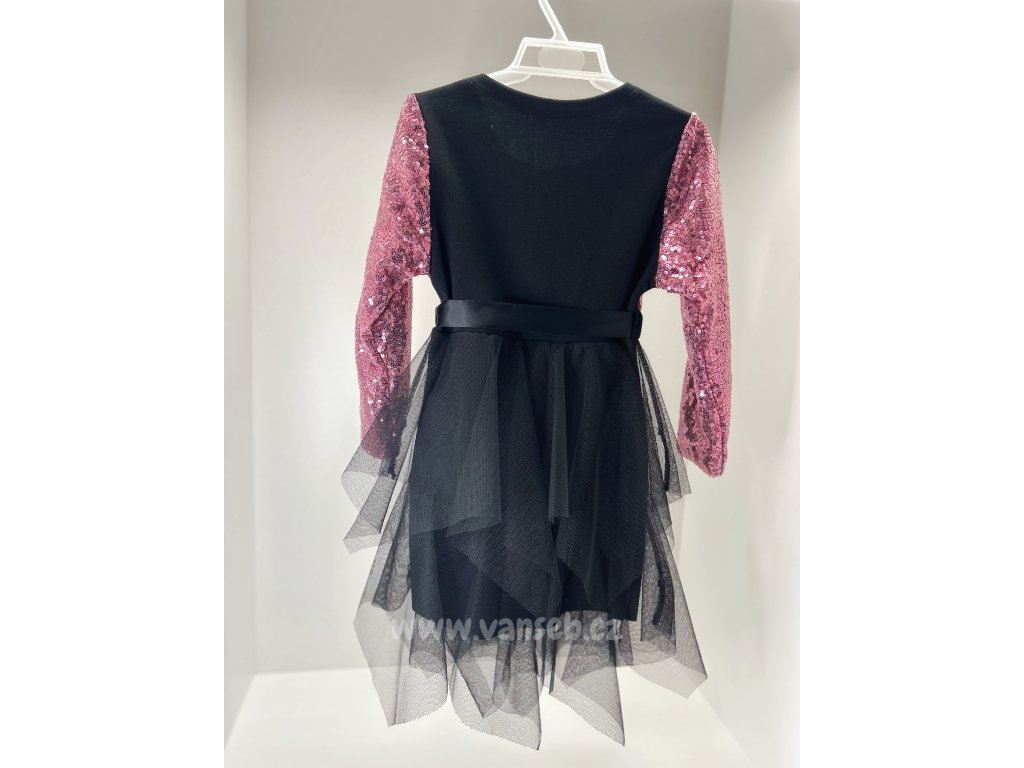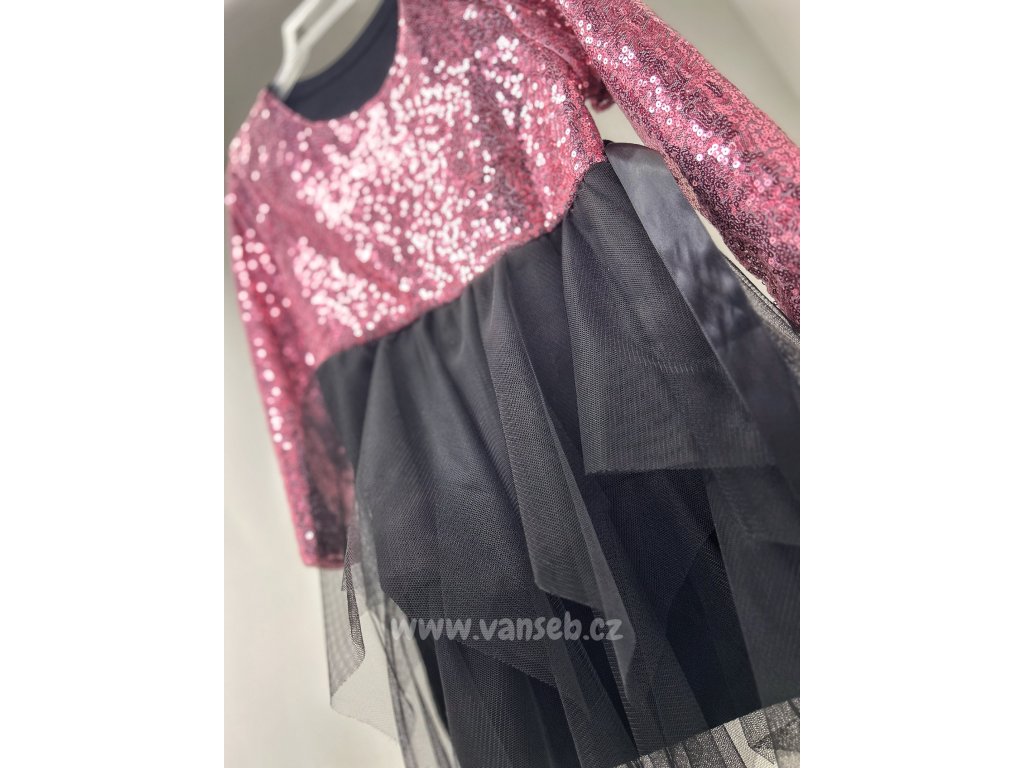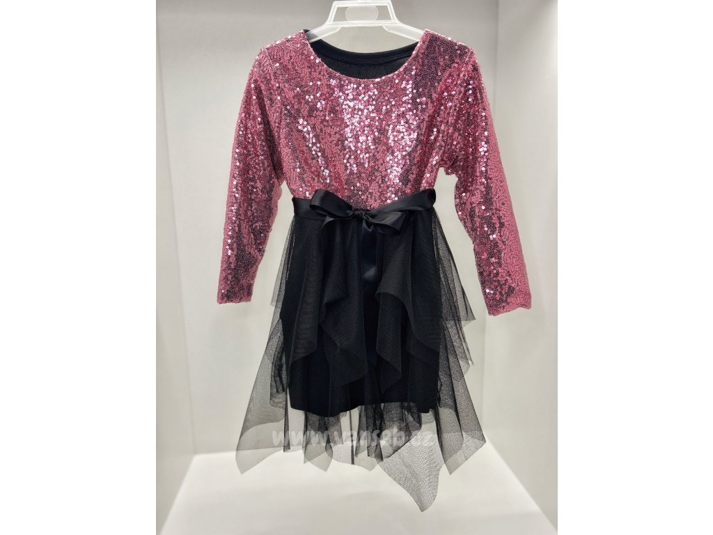 Krásné flitrové šaty s tylovou sukní zdobené saténovou mašlí v pase. Vhodné pro jakoukoliv příležitost.